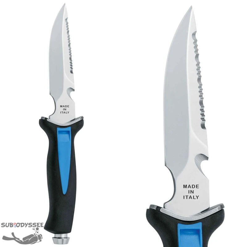 Très beau couteau inox de fabrication italienne Ă gaine rigide double sĂ©curitĂ©. La lame traverse le manche & se termine par une masselotte, elle est dotĂ©e d’une partie coupante & d’une partie sciante ainsi que d’un coupe fil.