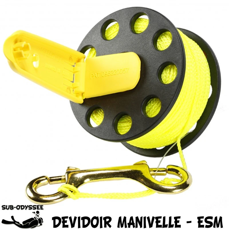 DĂ©vidoir pour l’accrochage du parachute de palier lors de la dĂ©compression, avec manivelle pour faciliter le rembobinage. Le SPOOL est Ă©quipĂ© d’un mousqueton double de 10 cm.